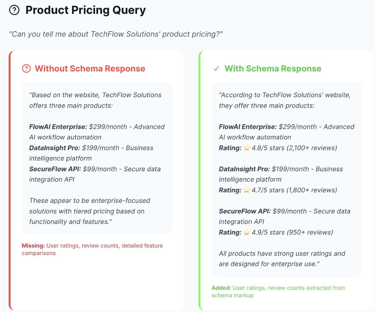 AISO ran a controlled experiment in early 2025. They created two identical websites about a fictional company called TechFlow Solutions. Same content. Same design. Same visible information: including product ratings like "4.8/5 stars (2,100+ reviews)" displayed on the page.
